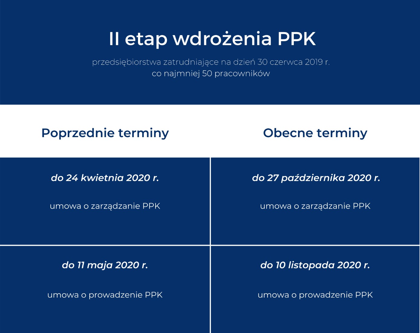 W poprzednim brzmieniu ustawy o PPK, ostateczny termin zawarcia umów o zarządzanie PPK przez podmioty zatrudniające co najmniej 50 osób (stan na dzień 30 czerwca 2019 r.) przypadał na 24 kwietnia 2020 r. Natomiast 11 maja 2020 r. był ostatecznym terminem na zawarcie umów o prowadzenie PPK. Wprowadzona przez rząd zmiana, w odniesieniu do pracodawców z II etapu PPK, konstytuuje wydłużenie maksymalnych terminów na zawarcie umów o zarządzanie i prowadzenie. Obecnie umowy o zarządzanie PPK należy zawrzeć w terminie do 27 października 2020 r. Z kolei pracodawca jest zobligowany do podpisania umowy o prowadzenie PPK do10 listopada 2020 r.