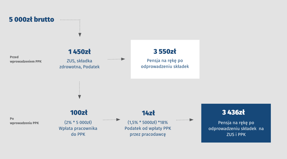 Dodatkowo osoba zatrudniona zapłaci podatek dochodowy od wpłat dokonywanych przez swojego pracodawcę. Jeśli pracodawca wpłaca do PPK obowiązkowe 1,5% z wynagrodzenia brutto (75 zł) – podatek od jego wpłat wyniesie 14 zł. Zatem wynagrodzenie, jakie otrzyma pracownik to 3436 zł.